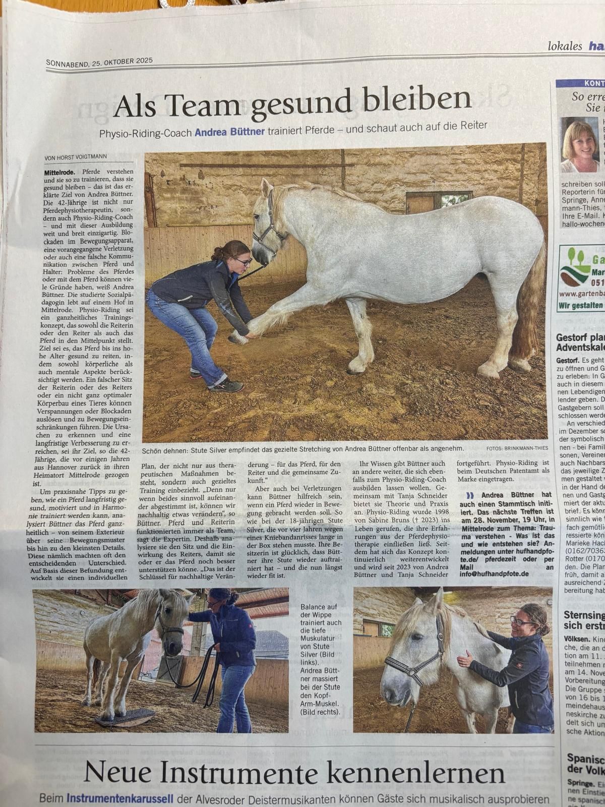 Mit meinem ganzheitlichen Ansatz als PHYSIO-RIDING® Coach & Ausbilderin und Tierphysiotherapeutin HR® begleite ich dich sowohl in der Theorie als auch in der praktischen Umsetzung.